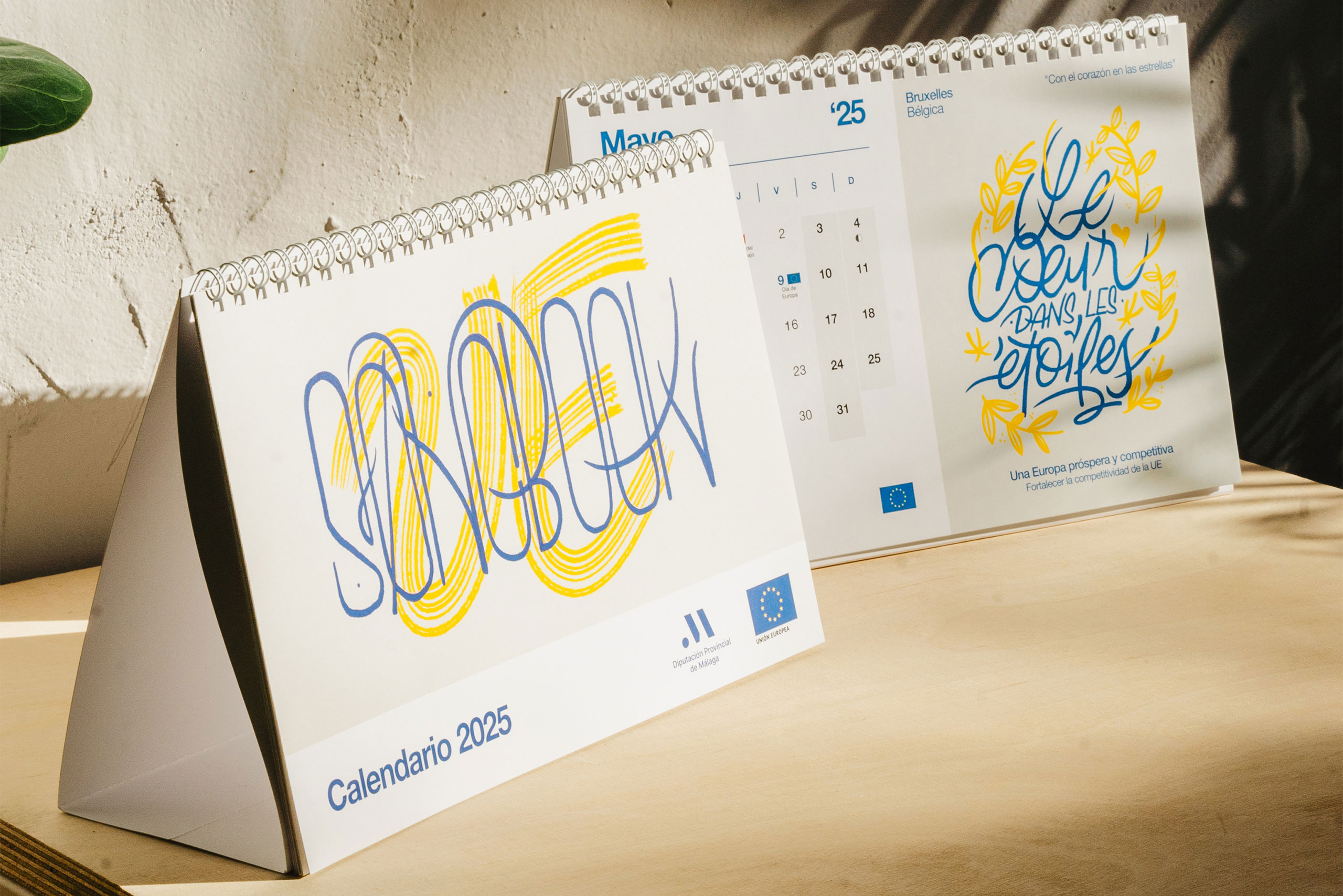 Desarrollamos el concepto creativo, la narrativa y el diseño del calendario, partiendo de una idea clara: vincular cada mes a una canción representativa de los países de la Unión Europea. A través de una investigación previa, seleccionamos 12 temas y trabajamos sus letras como base creativa, desarrollando un calendario ilustrado mediante lettering. Cada mes se convirtió en una pieza única, combinando diseño tipográfico, cultura musical y valores institucionales.