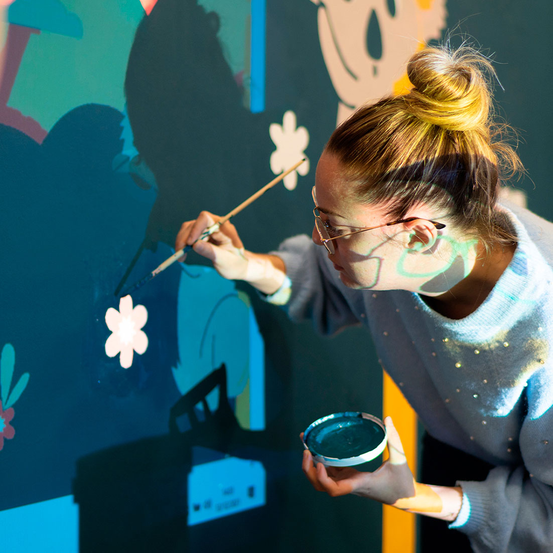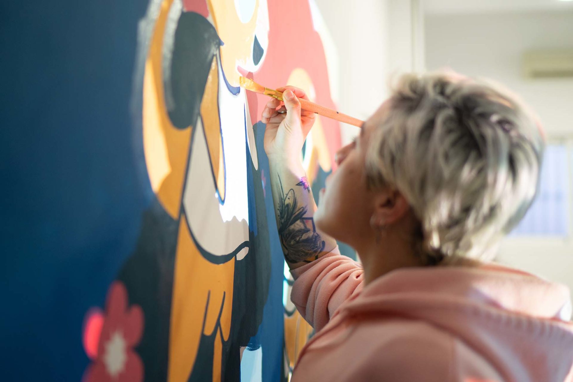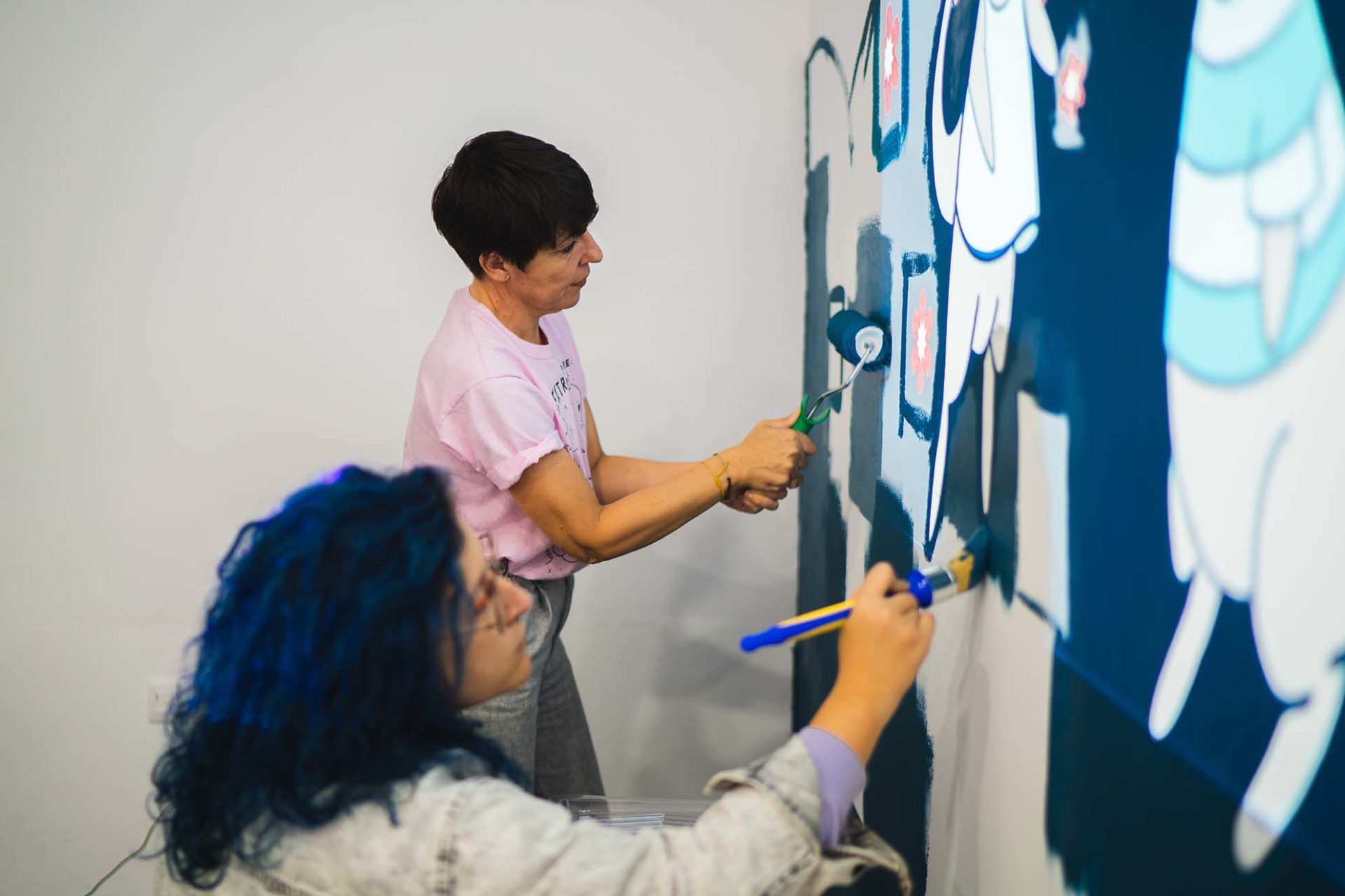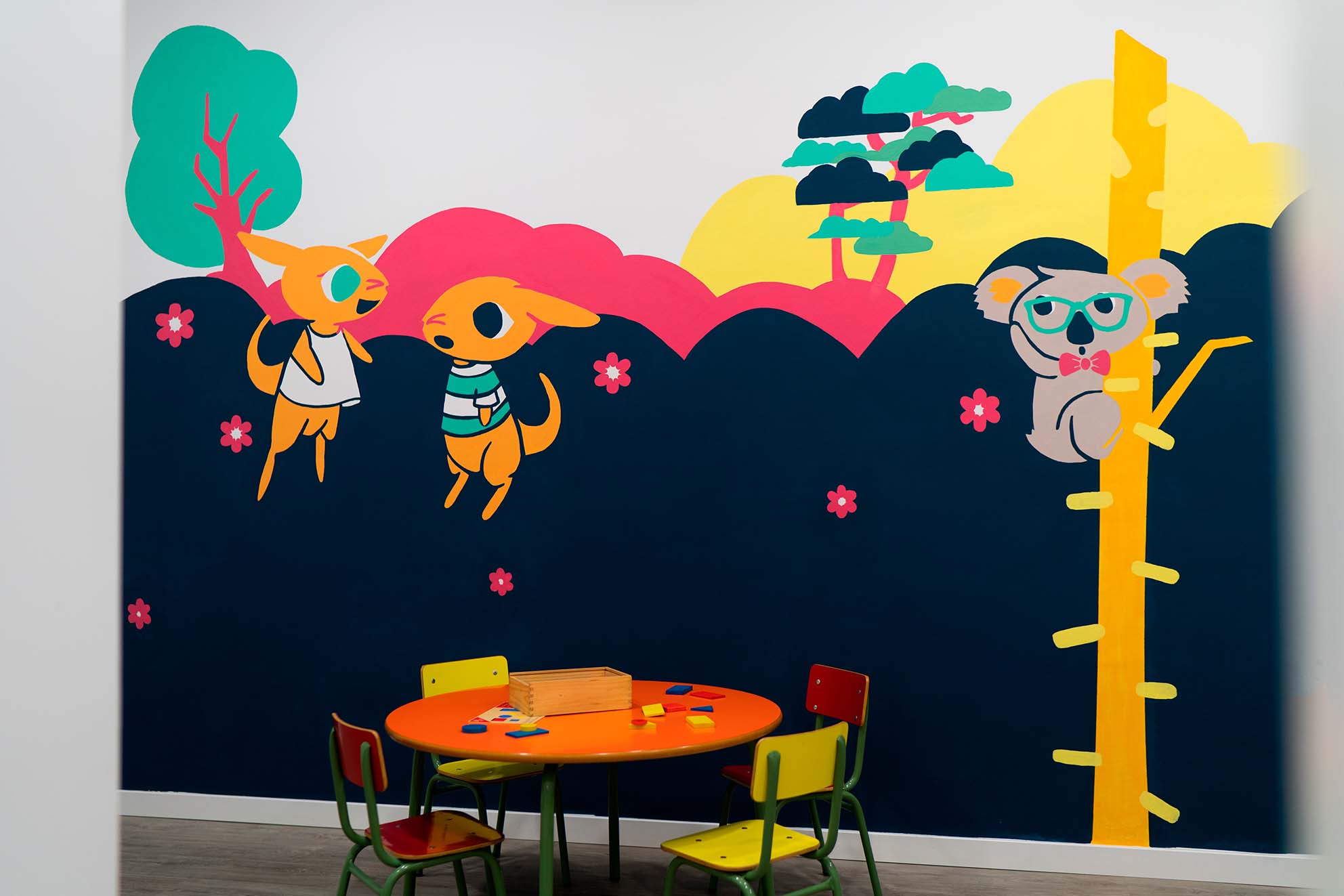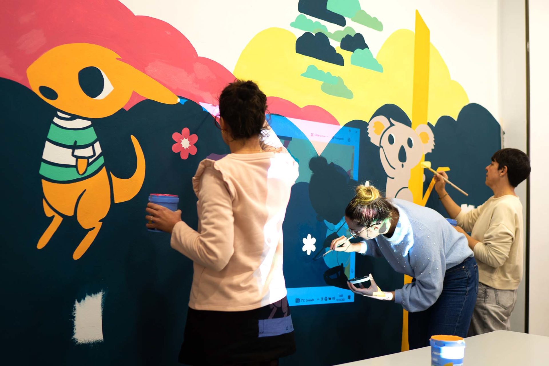 Utilizamos los personajes y entornos de la historia para ilustrar una pared completa, y participamos todo el equipo, junto con Sandra López, también ilustradora de la ciudad, y los peques tanto de la asociación como del equipo. Siluetear, rellenar, mancharnos las manos de pintura, ver el resultado avanzar y que se nos llene el corazón de ilusión.